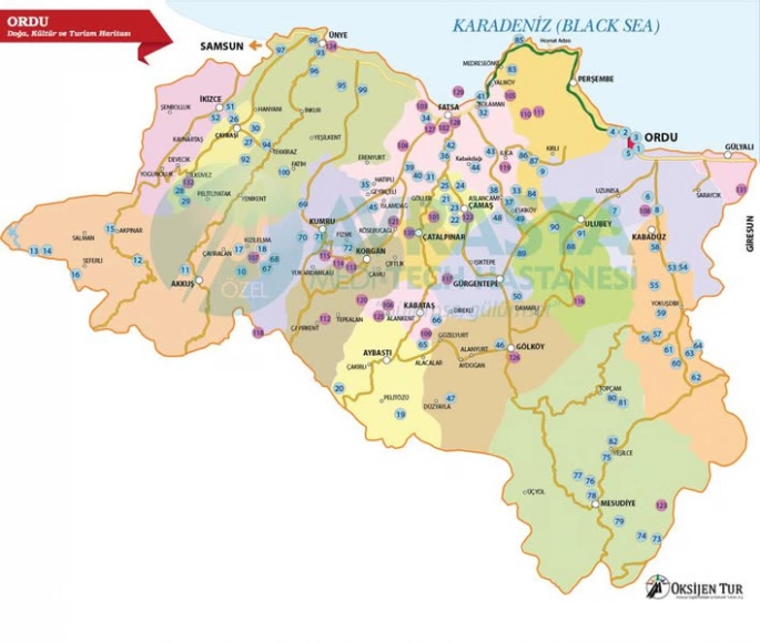 Harita üzerindeki 1'den başlayarak 132'ye varan sayıların her biri Ordu'muzun kültür VE turizm varlıklarından birini göstermektedir! Şüphesiz bizim henüz ulaşamadığımız Ordu'muzun diğer kültür ve turizm varlıkları vardır. Onlara elbirliği yaparak hep birlikte ulaşacağız!