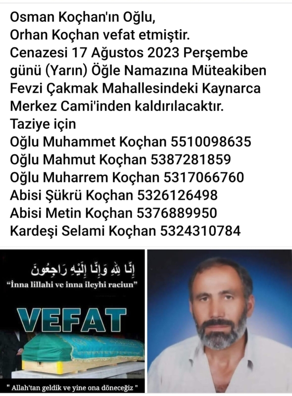 Pendik sakinlerinden Kaynarca da ikamet eden, Bayburtlu Osman Koçhan oğlu Orhan Koçhan vefat etti.