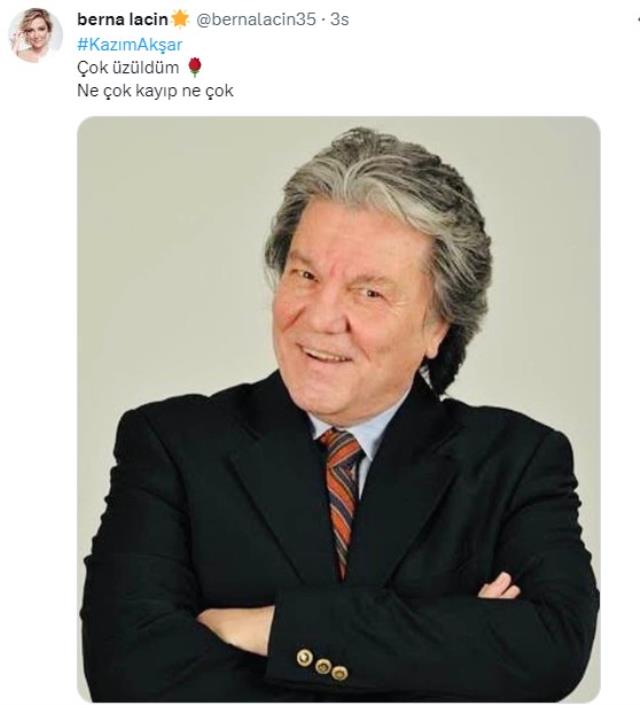 Cenaze töreni henüz belli olmayan Kazım Akşar, vefat haberinin duyulmasıyla sosyal medyada gündem oldu. Akşar’ın ölümüyle yıkılan Emre Karayel, Berna Laçin, Ayşegül Aldinç ve Orhan Aydın gibi ünlü isimler paylaşım yaptı.