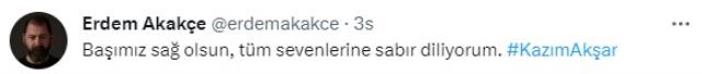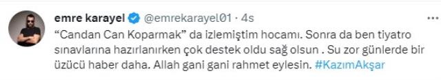 “Ah ki ne ah… Kazım Akşar niye be canım. Bu kadar acının üstüne senin acın kahretti sabah sabah. Çok üzgünüm, okul arkadaşım meslektaşım dostum. Nurlarda uyu. Mekanın cennet olsun. Tiyatro camiasının başı sağ olsun.”