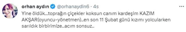 “Yine öldük… Toprağın çiçekler koksun canım kardeşim Kazım Akşar(oyuncu-yönetmen). En son 11 Şubat günü kızımı yolcularken sarıldık birbirimize. Acım sonsuz.”