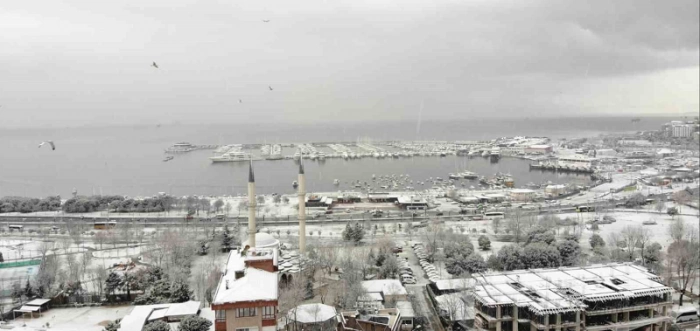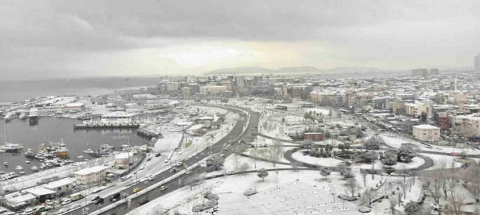 Kar yağışının ardından beyaz örtüyle kaplanan Pendik Marina ve çevresi, drone ile havadan görüntülendi.