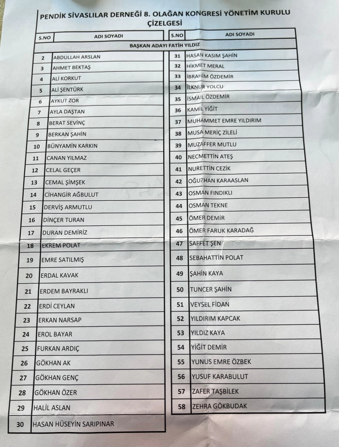 Pendik Sivaslılar Derneği’nin 8 olağan kongresi Işılay Düğün Salonu’nda gerçekleştirildi. Tek liste ile girilen kongrede Fatih Yıldız tekrar başkan seçildi.