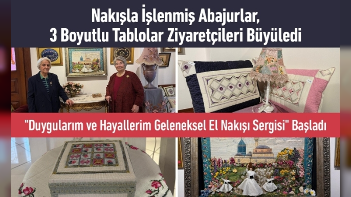 50’den fazla eserin bulunduğu sergide özellikle nakışla işlenmiş abajurlar dikkat çekerken yine nakışla işlenmiş 3 boyutlu tablolar da ziyaretçilerin beğenisini kazanan eserler arasında yer alıyor.