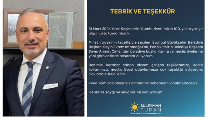 İYİ Parti Pendik Belediye Başkan Adayı Süleyman Turan, 31 Mart yerel seçimlerinin ardından bir tebrik ve teşekkür mesajı yayınladı.