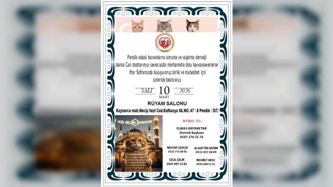 “Can dostlarımızı seven, kalbi merhametle dolu hayvanseverler” çağrısıyla duyurulan program, 10 Mart 2026 Salı günü gerçekleştirilecek. İftar organizasyonu, Pendik Kaynarca Mahallesi Necip Fazıl Caddesi Kafkasya Sokak No:47/8 adresinde bulunan Rüyam Salonu’nda yapılacak.