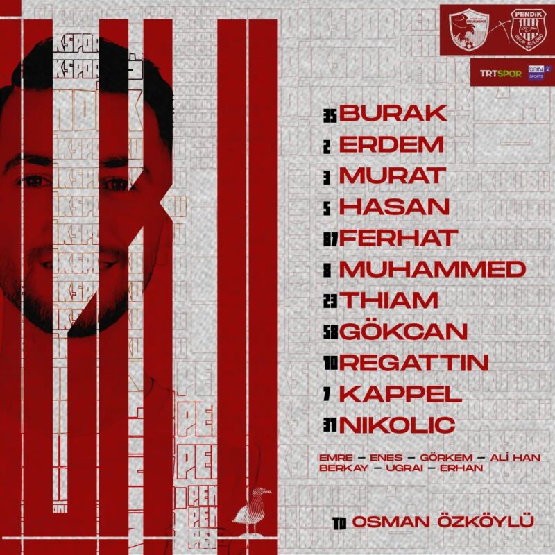 PENDİKSPOR: Burak Ferhat (Dk. 79 Erhan), Hasan, Erdem, Murat, Thiam, Gökcan (Dk. 79 Ugrai), Muhammed (Dk. 68 Enes), Kappel (Dk. 60 Görkem), Regattin, Nkolica (Dk.60 Ali Han)