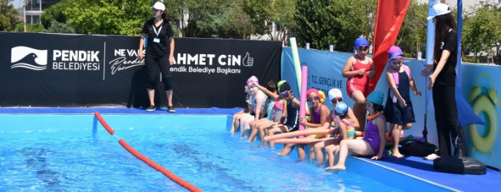 Gençlik ve Spor Başkanlığı ile Pendik Belediyesi ortaklığıyla çocuklar ve gençler yüzme öğreniyor. Kurslar için Kurtköy Spor Salonu bahçesine 16 metrelik portatif havuz konuldu.