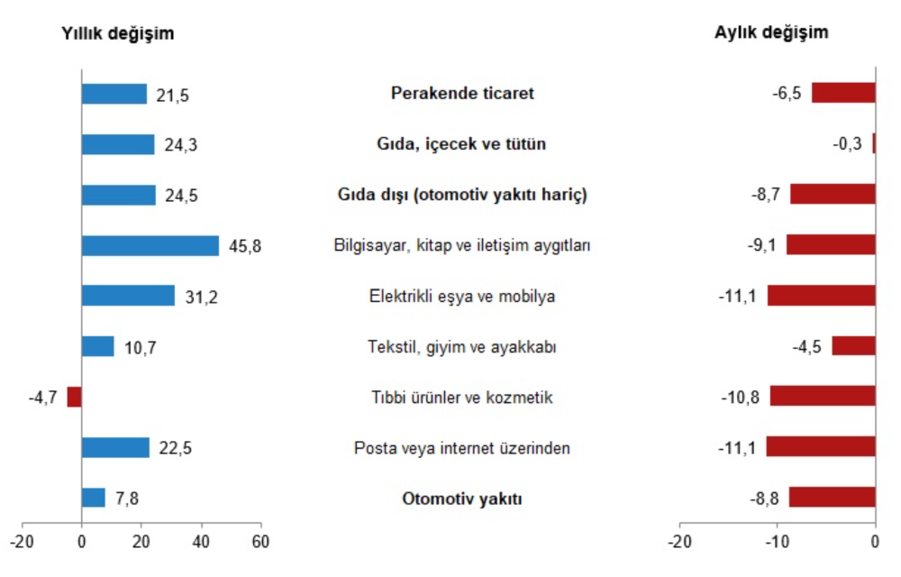 Sabit fiyatlarla perakende satış hacmi (2015=100) 2023 yılı Şubat ayında bir evvelki yılın birebir ayına nazaran %21,5 arttı. Birebir ayda besin, içecek ve tütün satışları %24,3, besin dışı satışlar (otomotiv yakıtı hariç) %24,5, otomotiv yakıtı satışları ise %7,8 arttı.