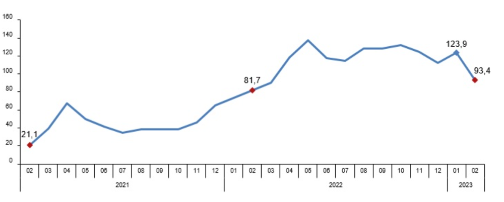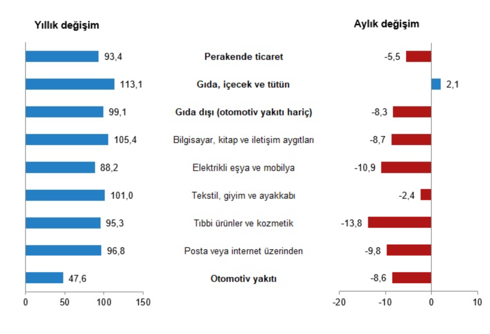 Sabit fiyatlarla perakende satış hacmi (2015=100) 2023 yılı Şubat ayında bir evvelki aya nazaran %6,5 azaldı. Tıpkı ayda besin, içecek ve tütün satışları %0,3, besin dışı satışlar (otomotiv yakıtı hariç) %8,7, otomotiv yakıtı satışları ise %8,8 azaldı.