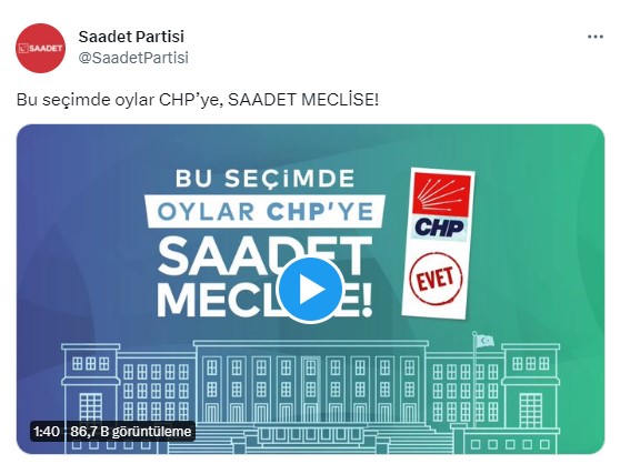 “Türkiye uzun vakittir yarını düşünmekten bugünü yaşayamıyor. Geçim ezası çekmekten insanca yaşayamıyor. Haksızlığa uğramaktan hakkını alamıyor. Ülkemiz bu noktaya sistemli bir formda getirildi. Zira onların kurduğu sistem haksızlık üretti adalete müsaade vermedi. Sistemleri daima bir kişi için çalıştı. Demokrasiye müsaade vermedi. Yandaşlarına imkan sundu, vatandaşa imkan vermedi. Bu sistem daima adamına nazaran işledi. Yalnızca kendilerini güçlendirdi. Artık de bu bozuk sistemi korumak için seçim sistemini değiştirdiler. Bu seçim sistemi bildiğimiz üzere değil. Bu seçim sistemi, milletin değil kendilerinin kazanması için Milletin beraberliği bütün hesaplarını bozdu. Bu seçimde güçlenen milletin birlikteliği oldu. İşte bu yüzden bu seçimde sandıklar, sandıkları üzere olmayacak. Zira bu seçimde biri değil, ülkemizin her biri kazanacak. Bu seçimde millet, çok daha güçlü bir halde birlikte. Bu seçimde oylar CHP'ye, Saadet Meclis'e.”