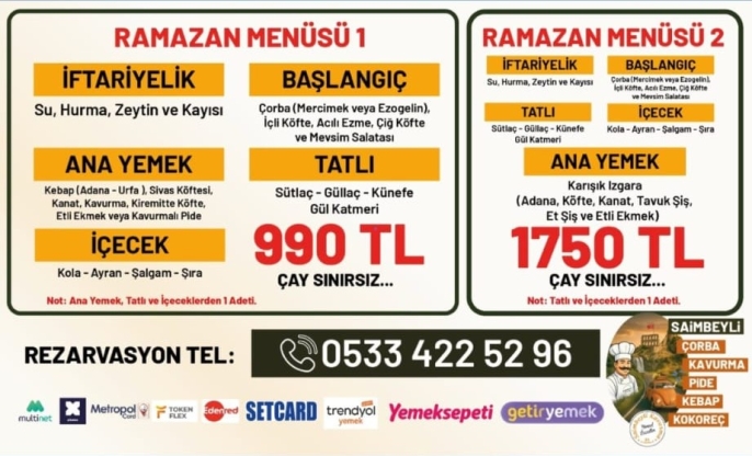 Rezervasyonlar 0533 422 52 96 numaralı telefon üzerinden alınırken, Saimbeyli Kavurma Ramazan boyunca misafirlerine hem geleneksel lezzetleri hem de sıcak bir aile ortamını bir arada sunmayı hedefliyor.