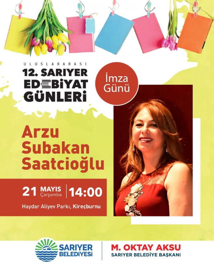 Arzu Subakan Saatçioğlu 12. Sarıyer Edebiyat Günleri kapsamında, 21 Mayıs Çarşamba günü saat 14.00’da Haydar Aliyev Parkı’nda (Kireçburnu) bir imza günü gerçekleştirecek.
