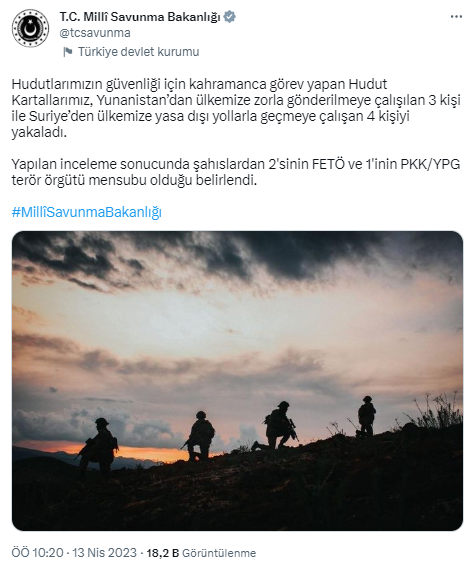 “Hudutlarımızın güvenliği için kahramanca görev yapan hudut kartallarımız, Yunanistan’dan ülkemize zorla gönderilmeye çalışılan 3 kişi ile Suriye’den ülkemize yasa dışı yollarla geçmeye çalışan 4 kişiyi yakaladı. Yapılan inceleme sonucunda şahıslardan 2'sinin FETÖ ve 1'inin PKK/YPG terör örgütü mensubu olduğu belirlendi.”