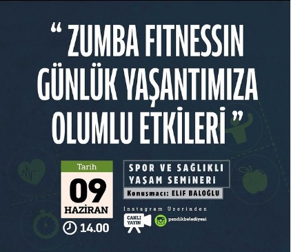 Pendik Belediyesi, ‘Zumba Fitnessın Günlük Yaşantımıza Olumlu Etkileri’ konulu seminer düzenliyor. Konuşmayı Elif Baloğlu yapacak.
