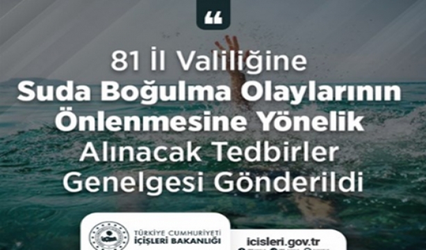 Bakanlığımız 2022 yılında meydana gelen 476 suda boğulma olayında 244 kişin hayatını kaybetmesi, 287 kişinin kurtarılması üzerine 81 İl Valiliğine “Suda Boğulma Olaylarının Önlenmesine Yönelik Alınacak Tedbirler” konulu genelge gönderdi. Genelgede denizler, göl ve göletler, barajlar, sulama kanalları, akarsu yatakları ve havuzlarda meydana gelebilecek boğulma olaylarının ve can kayıplarının önlenmesi açısından büyük önem arz ettiği belirtildi. 5442 sayılı İl İdaresi Kanununun 11’inci maddesince “İl sınırları içinde huzur ve güvenliğin, kişi dokunulmazlığının, tasarrufa müteaallik emniyetin, kamu esenliğinin sağlanması ve önleyici kolluk yetkisi valinin ödev ve görevlerindendir. Bunları sağlamak için vali gereken karar ve tedbirleri alır.” hükmü hatırlatılarak, boğulma olaylarının önüne geçilmesi için valiliklerden şu tedbirlerin alınması istendi.