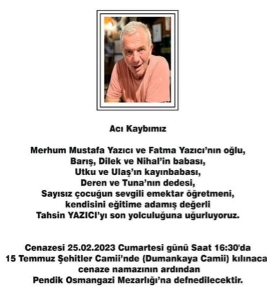 Pendik sakinlerinden Tahsin Yazıcı vefat etti. Başta ailesi olmak üzere tüm yakınlarına başsağlığı ve sabır diliyoruz.