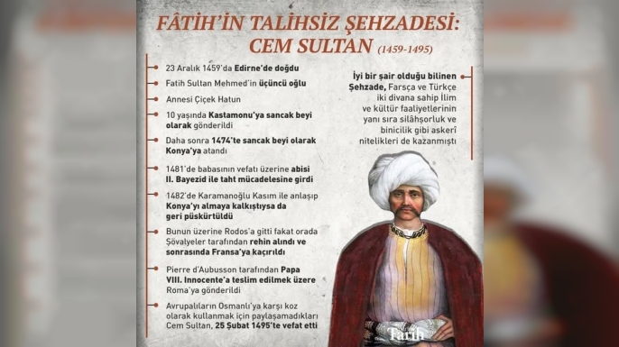 1459 yılında Edirne’de dünyaya gelen Cem Sultan, küçük yaşta sancak beyliği görevine gönderilerek devlet idaresinde tecrübe kazandı. Babası Fatih Sultan Mehmed’in vefatının ardından ağabeyi II. Bayezid ile giriştiği taht mücadelesi ise hayatının dönüm noktası oldu. Bursa’da kısa süreli saltanat ilanı ve adına para bastırmasıyla iddiasını ortaya koyan Cem, Yenişehir yenilgisi sonrası Osmanlı topraklarından ayrılmak zorunda kaldı.