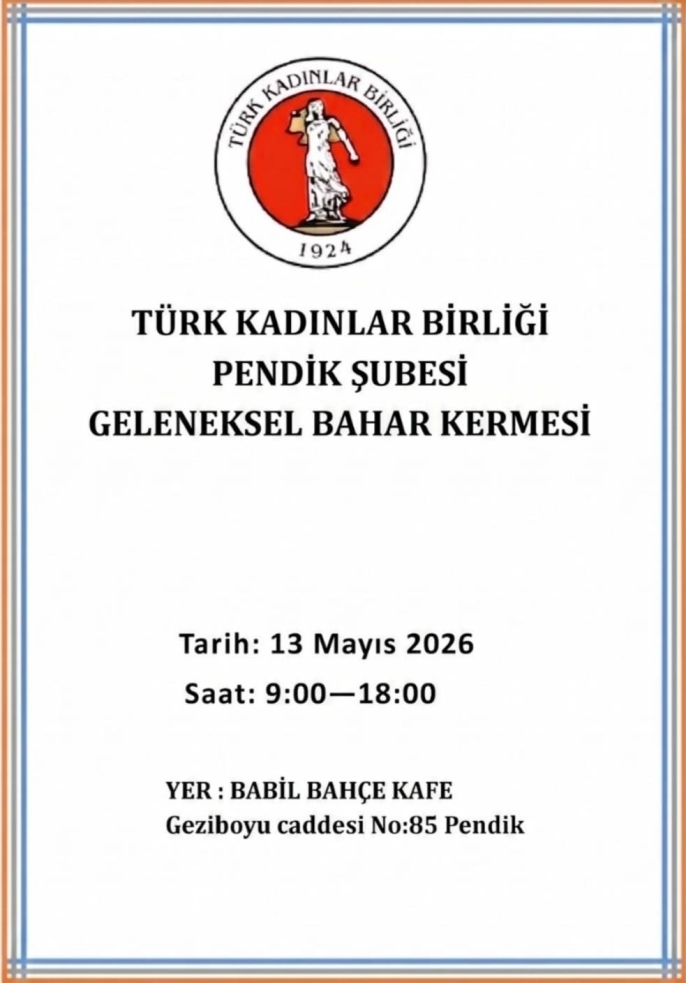 Başkanlığını Özen Öztanyel’in yürüttüğü Türk Kadınlar Birliği Pendik Şubesi’nin geleneksel bahar kermesi, 13 Mayıs Çarşamba günü 09.00 - 18.00 saatleri arasında Babil Bahçe Kafe’de (Geziboyu Caddesi No:85) gerçekleştirilecek.