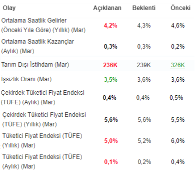 Kutsal Cuma sebebiyle fiyatlama tarafında tesirli tepki göremediğimiz 7 Nisan Cuma günü 236 binlik artış ile Tarım Dışı İstihdam verisi beklenti aralığına çok yakın sonuçlanırken İşsizlik Oranı yüzde 3,5 ile son 53 yılın en âlâ sayısı yüzde 3,4’e yaklaşmıştır. Her ne kadar Tarım Dışı İstihdam bir evvelki ayki 311 binlik yükselişin altındaki bir sayı ile sonuçlansa da hatta son devirde teknoloji yüklü şirketlerde işten çıkartmaların kıymetli bir popülerlik kazandığını da düşünsek de istihdam tarafında değerli bir sorunun olmadığını uzun vakittir görmekteyiz. Ayrıyeten ortalama saatlik gelirlerin yıllık bazda yüzde 4,3 beklenti altında 4,2 olarak sonuçlanması da enflasyon üzerinde ek bir baskı yaratmama kanısı Kutsal Cuma günü gündemimizi hayli meşgul etti.