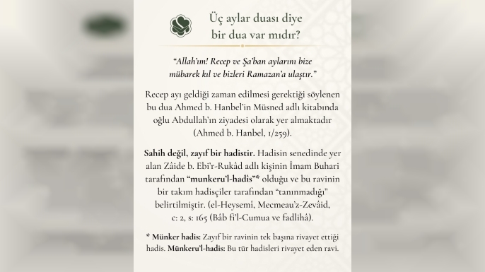 Recep ayı geldiği zaman edilmesi gerektiği söylenen bu dua Ahmed b. Hanbel’in Müsned adlı kitabında oğlu Abdullah’ın ziyadesi olarak yer almaktadır (Ahmed b. Hanbel, 1/259).