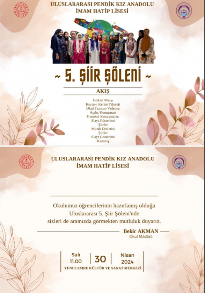 Uluslararası Pendik Kız Anadolu İmam Hatip Lisesi’nin geleneksel olarak 5.sini düzenlediği şiir şöleni Yunus Emre Kültür Merkezi’nde 30 Nisan Salı günü saat 11.00’de gerçekleştirilecek.