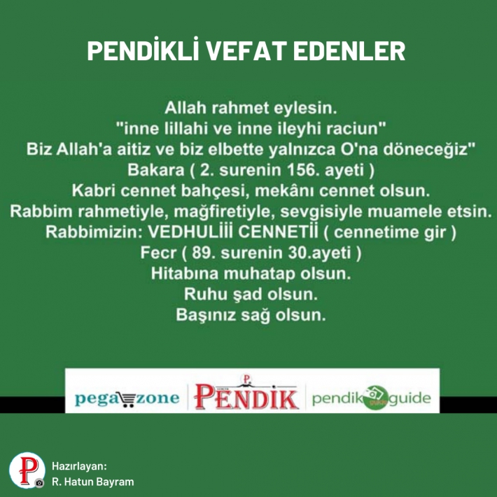Hakkın rahmetine kavuşan merhum/merhumelere Allah’tan rahmet yakınlarına başsağlığı ve sabır diliyoruz. Mekanları cennet olsun.