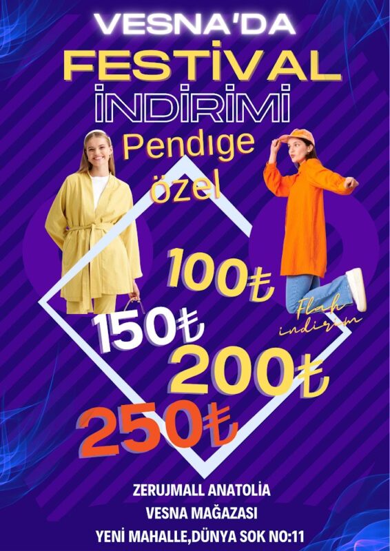 Yeni Mahalle, Dünya Sokak no:11 adresinde bulunan Vesna Mağazası, 100, 150, 200,250 TL’lik indirimleri ile Pendik’te.