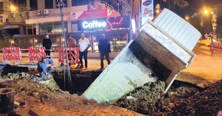 Hafriyatın ağır gelmesi sonucu yolda çökme oldu. Hafriyat yüklü kamyon da kayarak çukura düştü. İhbar üzerine olay yerine vinç geldi.
