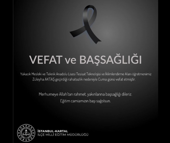 Kartal -Yakacık Mesleki ve Teknik Anadolu Lisesi Tesisat Teknolojisi ve İklimlendirme Alanı öğretmeni Züleyha AKTAŞ geçirdiği rahatsızlık nedeni ile vefat etti. Kendisine Allah’tan rahmet diliyor, ailesine ve tüm sevenlerine sabırlar diliyoruz.
